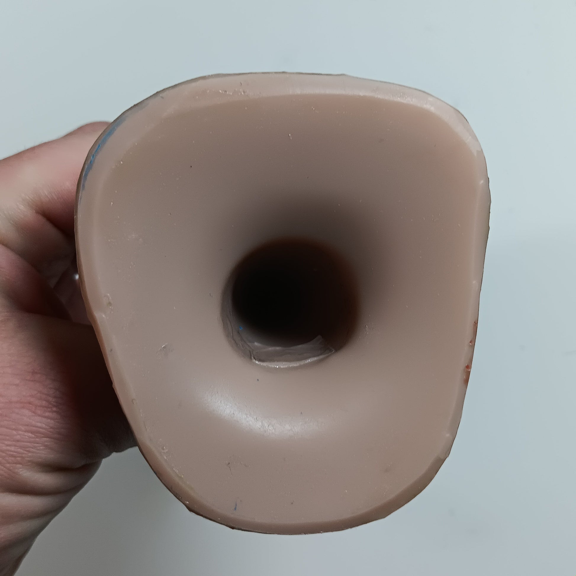It is sculpted in platinum silicone and features a hollow center channel for suction with a partner, but it is not compatible with the syringe ejection system.